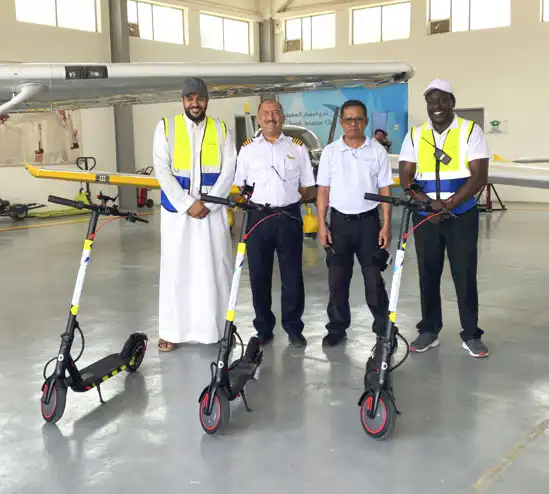 The Saudi Aviation Club has provided electric bicycles as a means of transportation between the facilities of Al-Thumama Airport for employees working at the airport to preserve the environment and reduce carbon emissions.